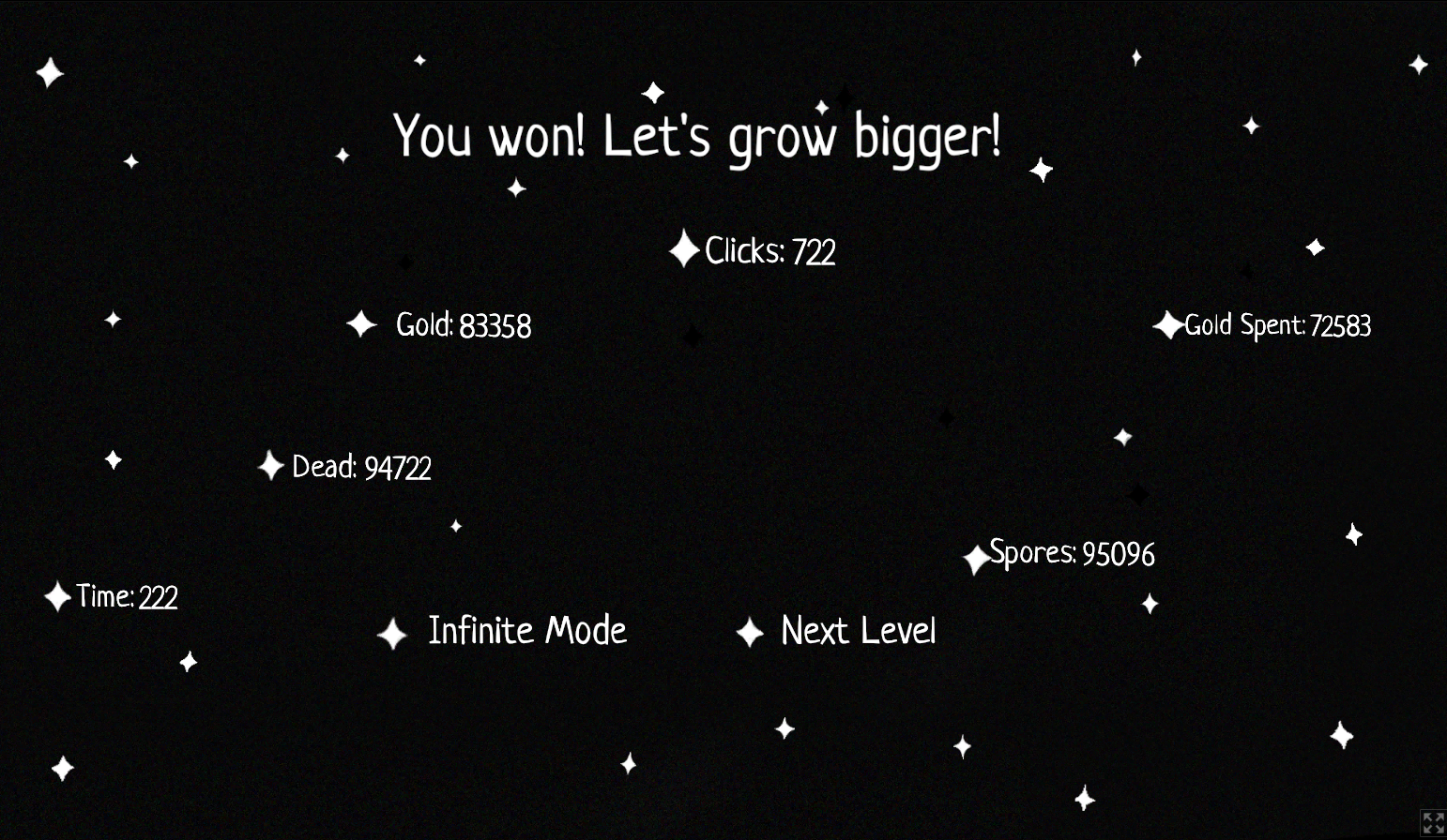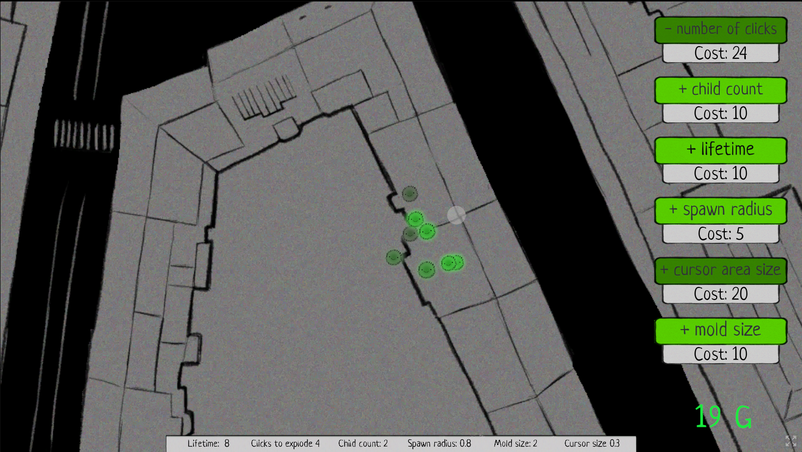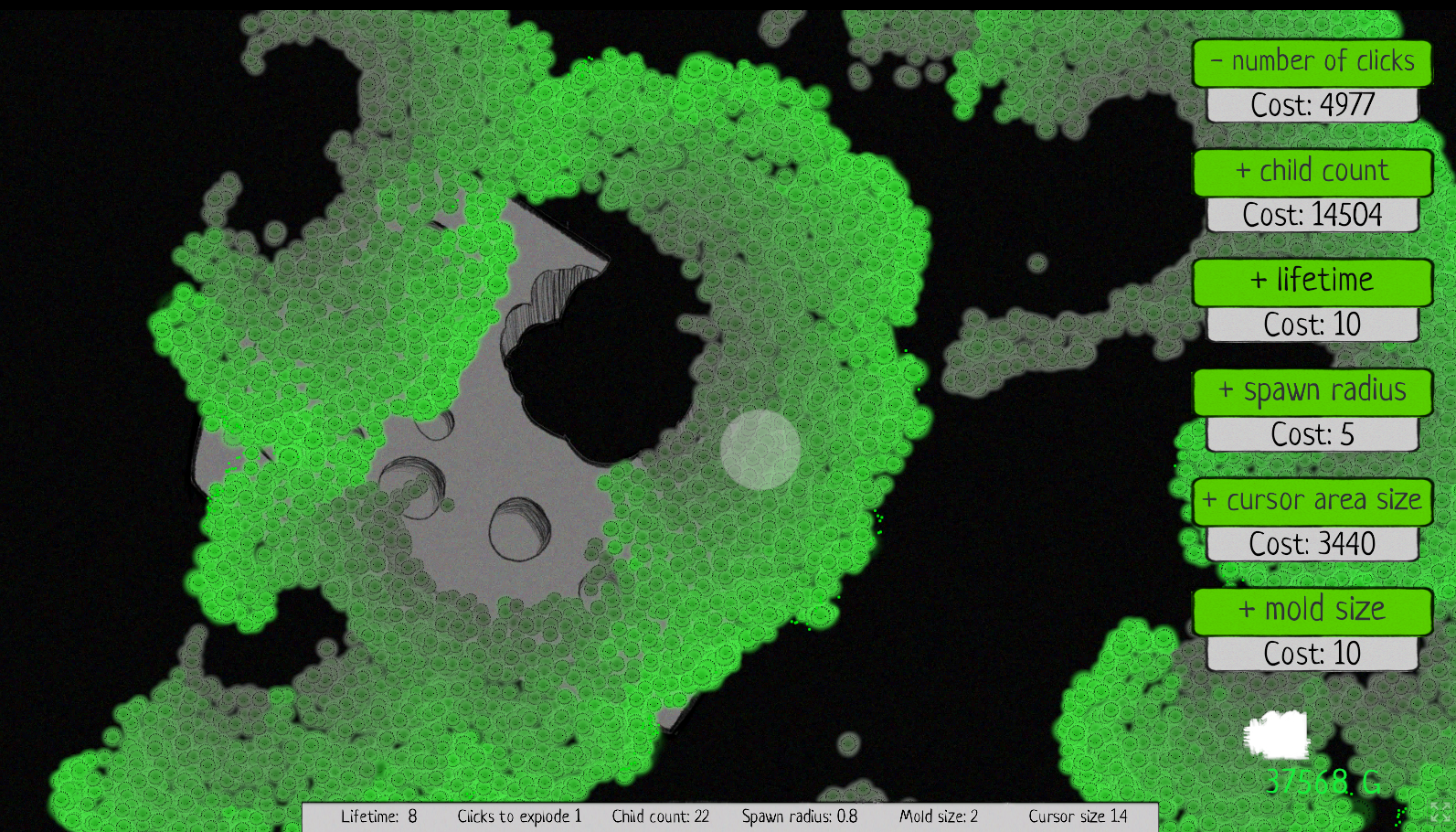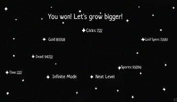 Nice game, the art is really really cute, I love the little faces on the mould spores :3 Also enjoyed the subtle storyline of it growing bigger and bigger through the levels!